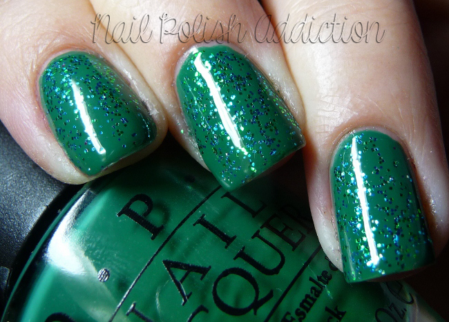 I used two very thin coats of Jade Is The New Black and one also thin coat of the glitter, plus a thin coat of Seche Vite to make it perfectly smooth.